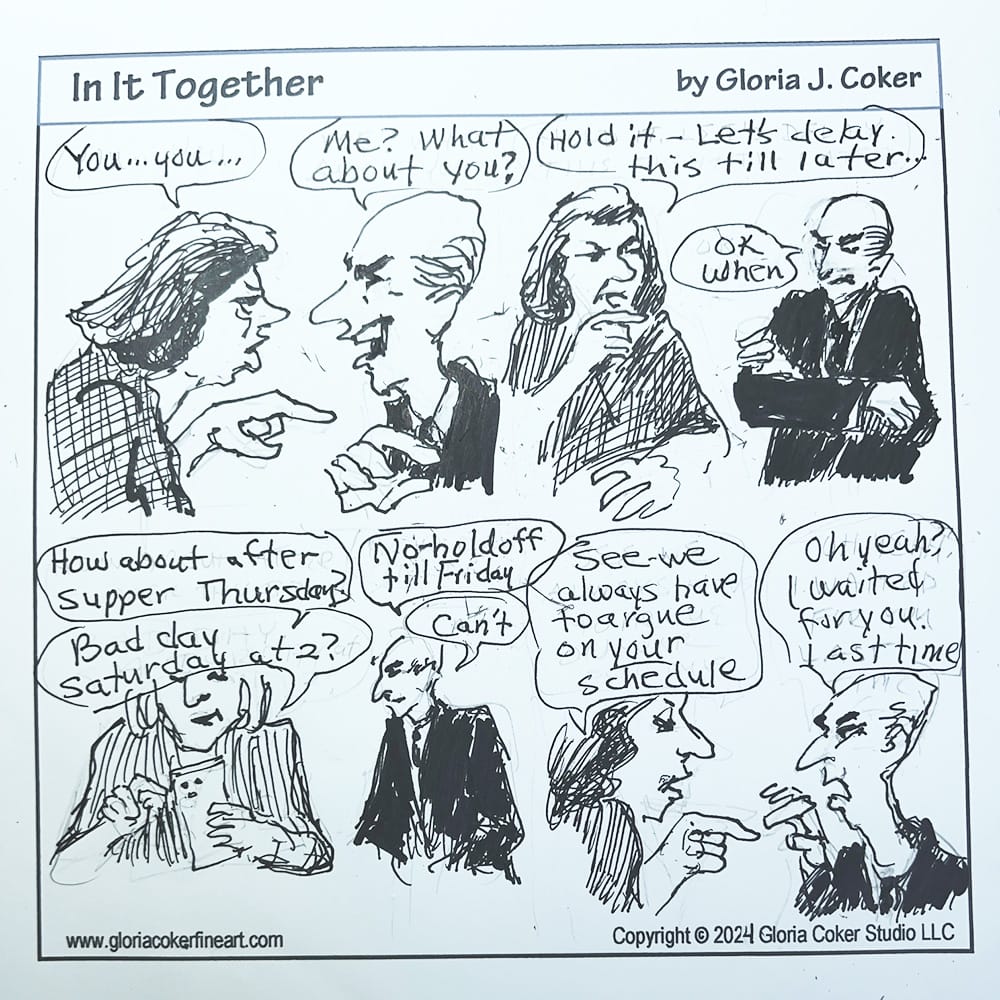 I was thinking about how busy everyone is (or pretends to be) and wondered how I could relate it to everyday relationships. So scheduling arguments and bickering seemed appropriate for a cartoon panel.